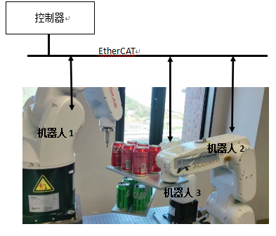 由于自主研發的智能通用控制器可支持多機器人控制,因此采用一臺控制器同時控制三臺機器人。EtherCAT總線通信,采用EtherCAT主站,通信周期1ms。